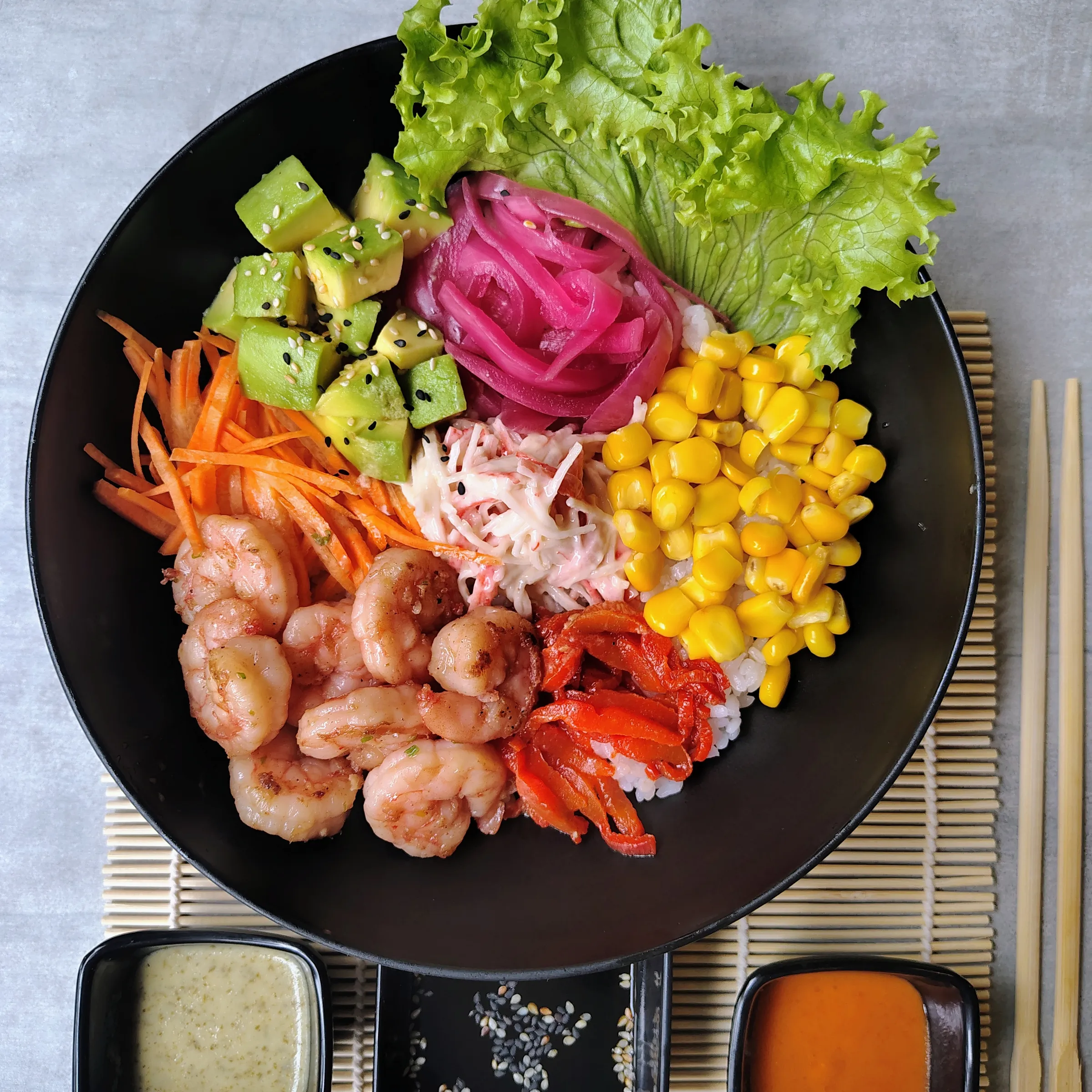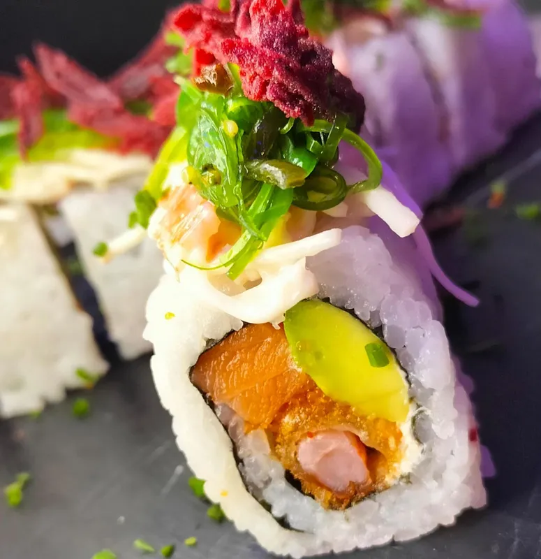 Salmón, kanikama apanado, aguacate, queso crema, con cubierta ajonjolí, con topping de ensalada de kanikama, alga seaweed y remolacha crispy.
